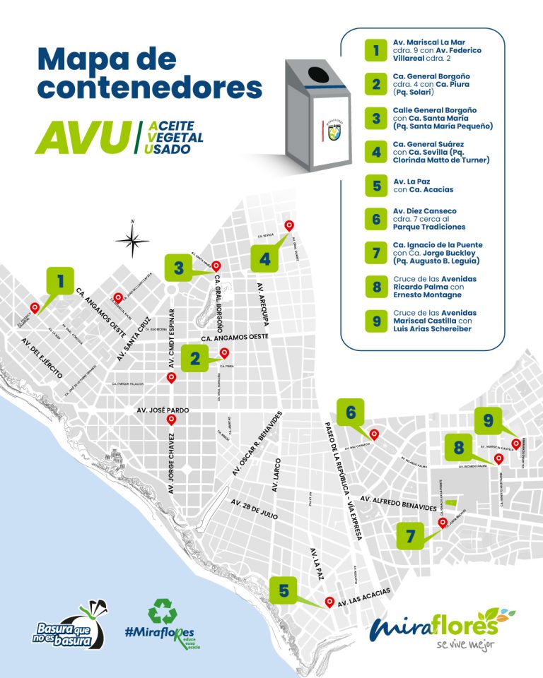 A fin de minimizar el impacto negativo del inadecuado manejo del Aceite Vegetal Usado (AVU), la Municipalidad de Miraflores desarrolla el Programa de recolección de aceite vegetal usado. Para la correcta disposición del AVU, el ciudadano puede depositarlo en cualquiera de los contenedores distribuidos en el distrito.
