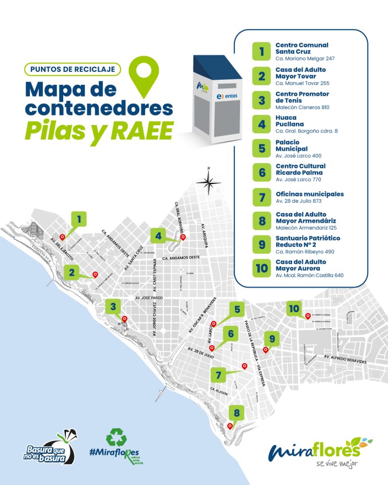 La Municipalidad viene desarrollando un sistema adecuado de recolección, acopio y disposición final de residuos de aparatos eléctricos, electrónicos y pilas usadas en contenedores especiales. Contamos con alianzas estratégicas, para la recolección de pilas y RAEE pequeños con la empresa ENTEL Perú y RAEE medianos y grandes con la Asociación Peruana de Actores para la Gestión de Residuos (ASPAGER).