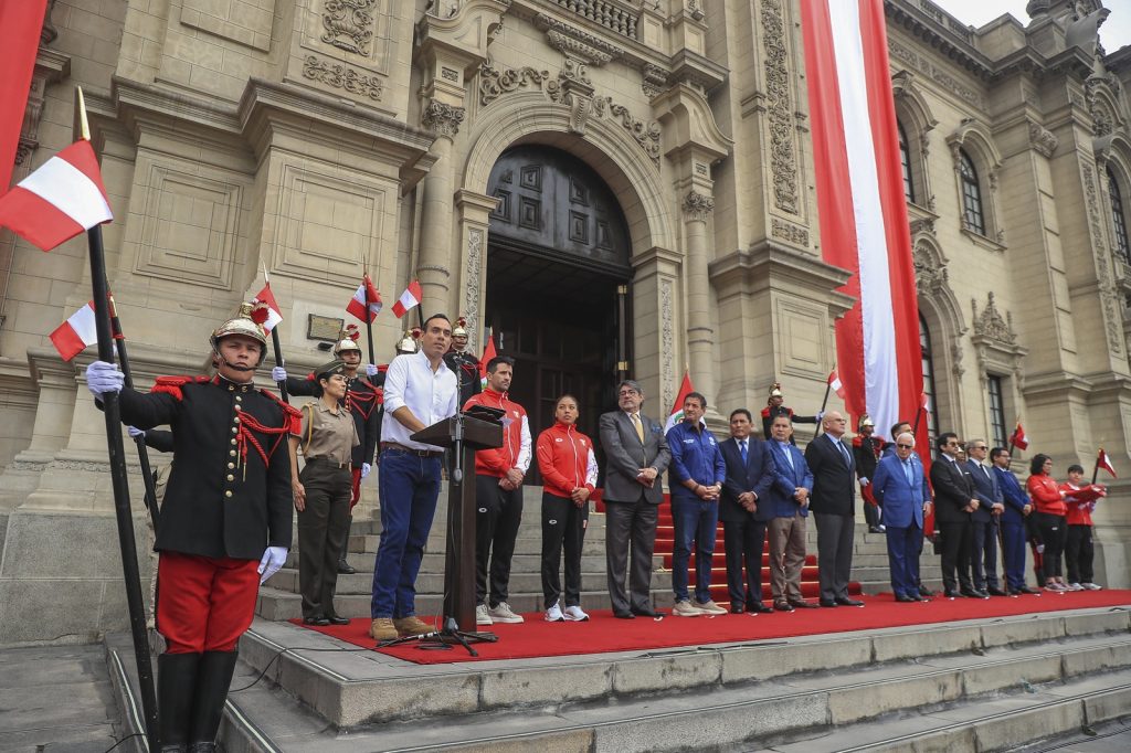 La ceremonia se desarrolló en el Patio de Honor del Palacio de Gobierno, donde el presidente de la República, José Jerí, recibió a las delegaciones participantes y encabezó la entrega del emblema nacional a los abanderados del Team Perú.