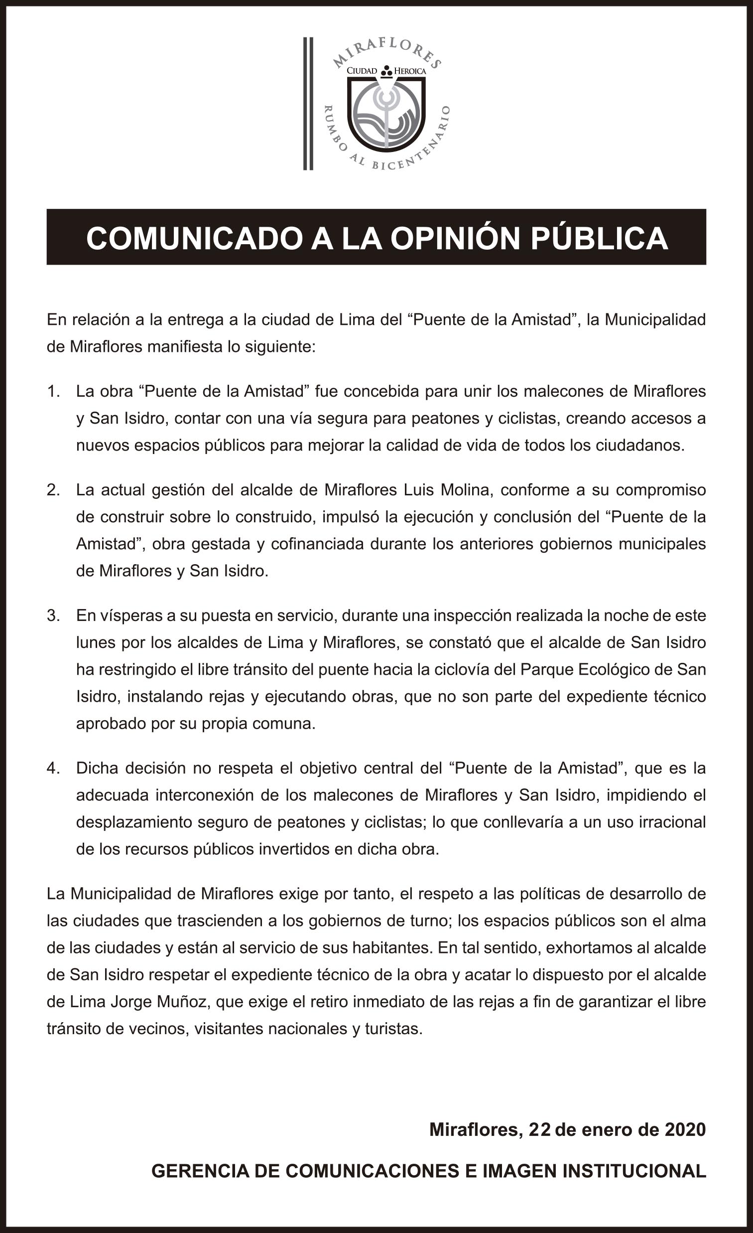 En relación a la entrega a la ciudad de Lima del “Puente de la Amistad”, la Municipalidad de Miraflores manifiesta lo siguiente: