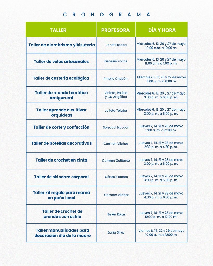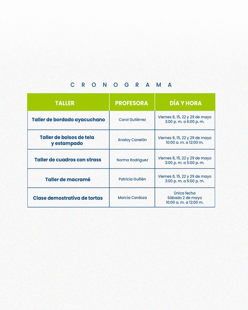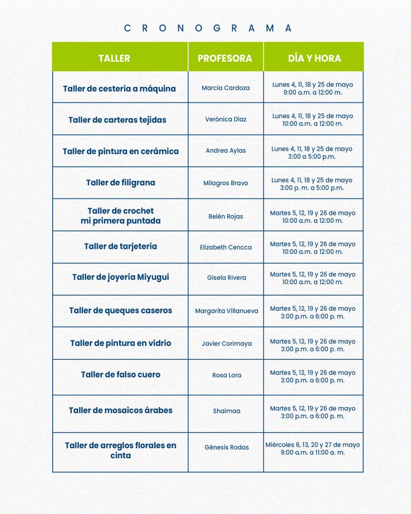 Miraflores, 28 de abril de 2026. A continuación, encontrarás la lista completa de talleres del mes de mayo del Programa Mujer, junto con sus fechas, horarios y detalles de participación. Las inscripciones se pueden realizar a través del siguiente enlace: https://hopp.bio/program-mujer