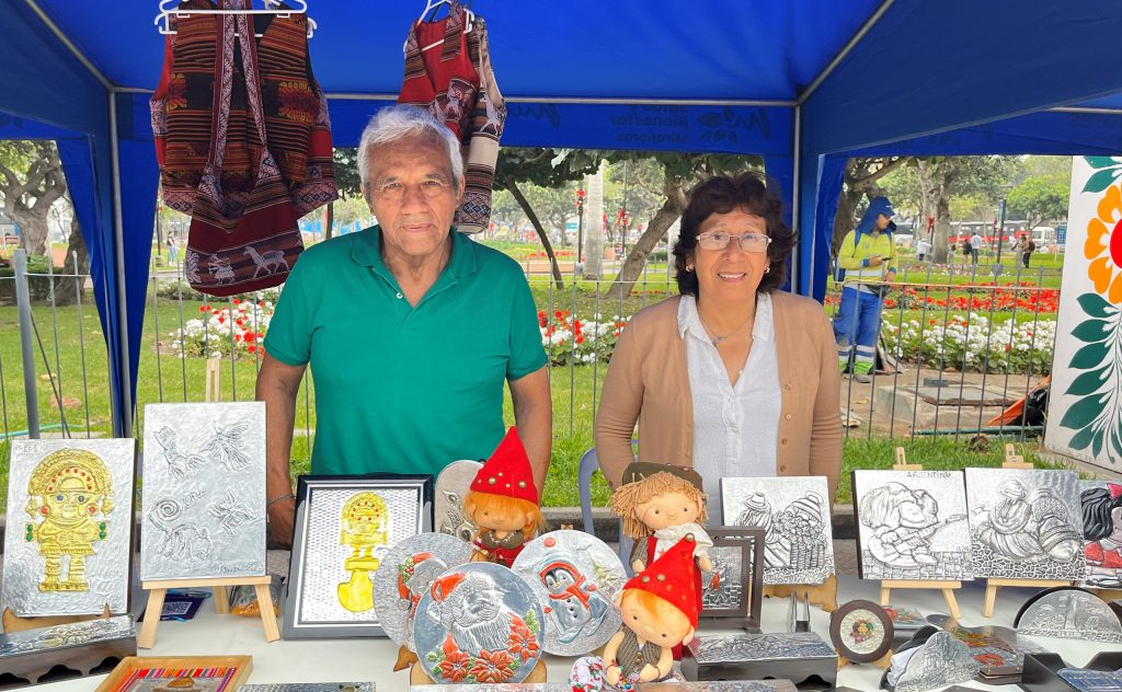 Ricardo Díaz y Rosario Martínez, esposos y usuarios de la Casa de los Años Dorados Aljovín, ingresaron por curiosidad al taller de repujado en aluminio y terminaron creando su emprendimiento familiar “DiaMarti”. “No sabíamos nada de esto, aprendimos desde cero y este año decidimos emprender. Ya hemos participado en varias ferias y queremos seguir creciendo”, indicó la señora Martínez.