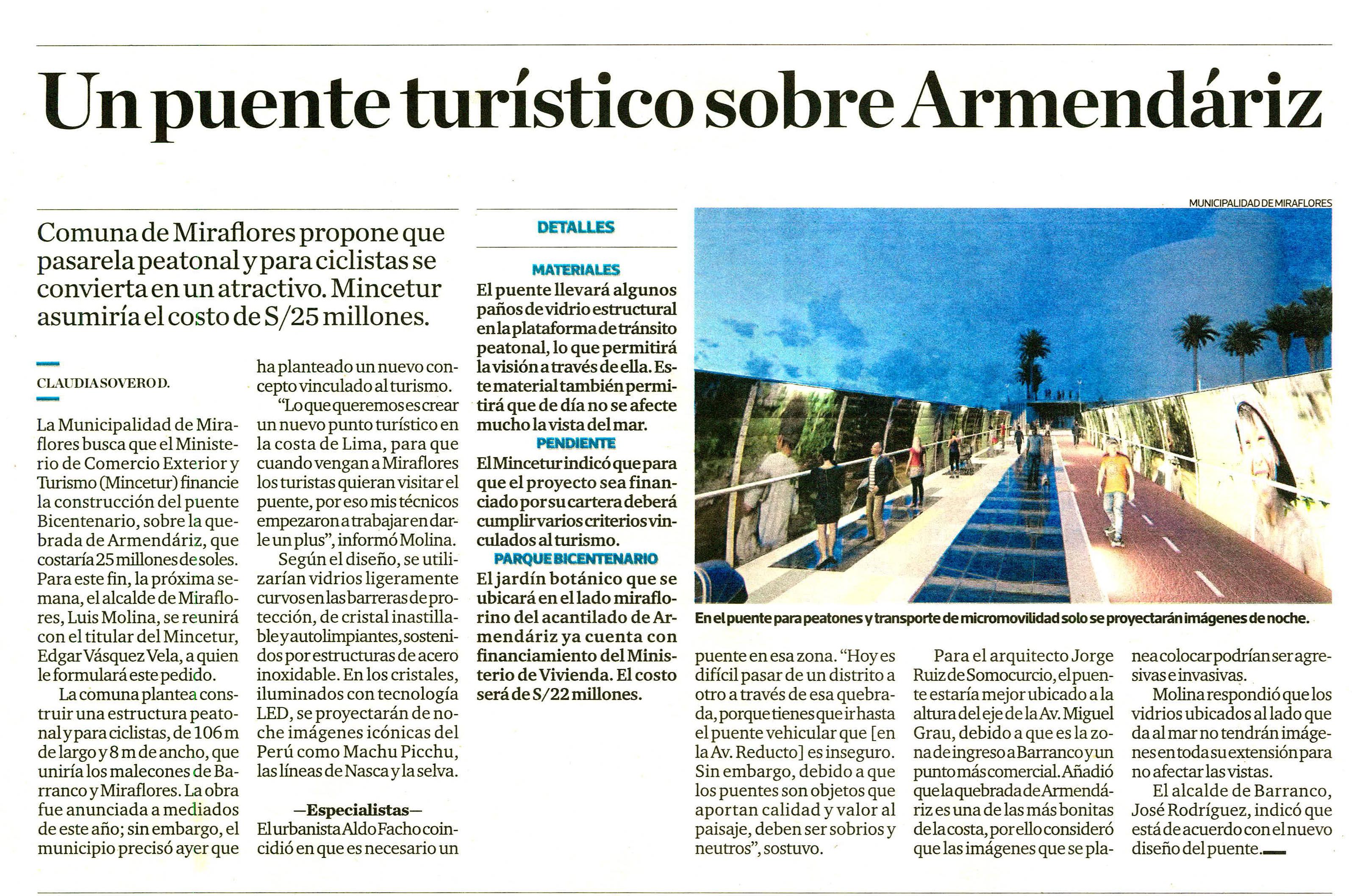 La Municipalidad de Miraflores busca que el Ministerio de Comercio Exterior y Turismo (Mincetur) financie la construcción del puente Bicentenario, sobre la quebrada de Armendáriz . Para este fin, la próxima semana, el alcalde de Miraflores, Luis Molina, se reunirá con el titular del Mincetur, Edgar Vásquez Vela, a quien le formulará oficialmente este pedido.