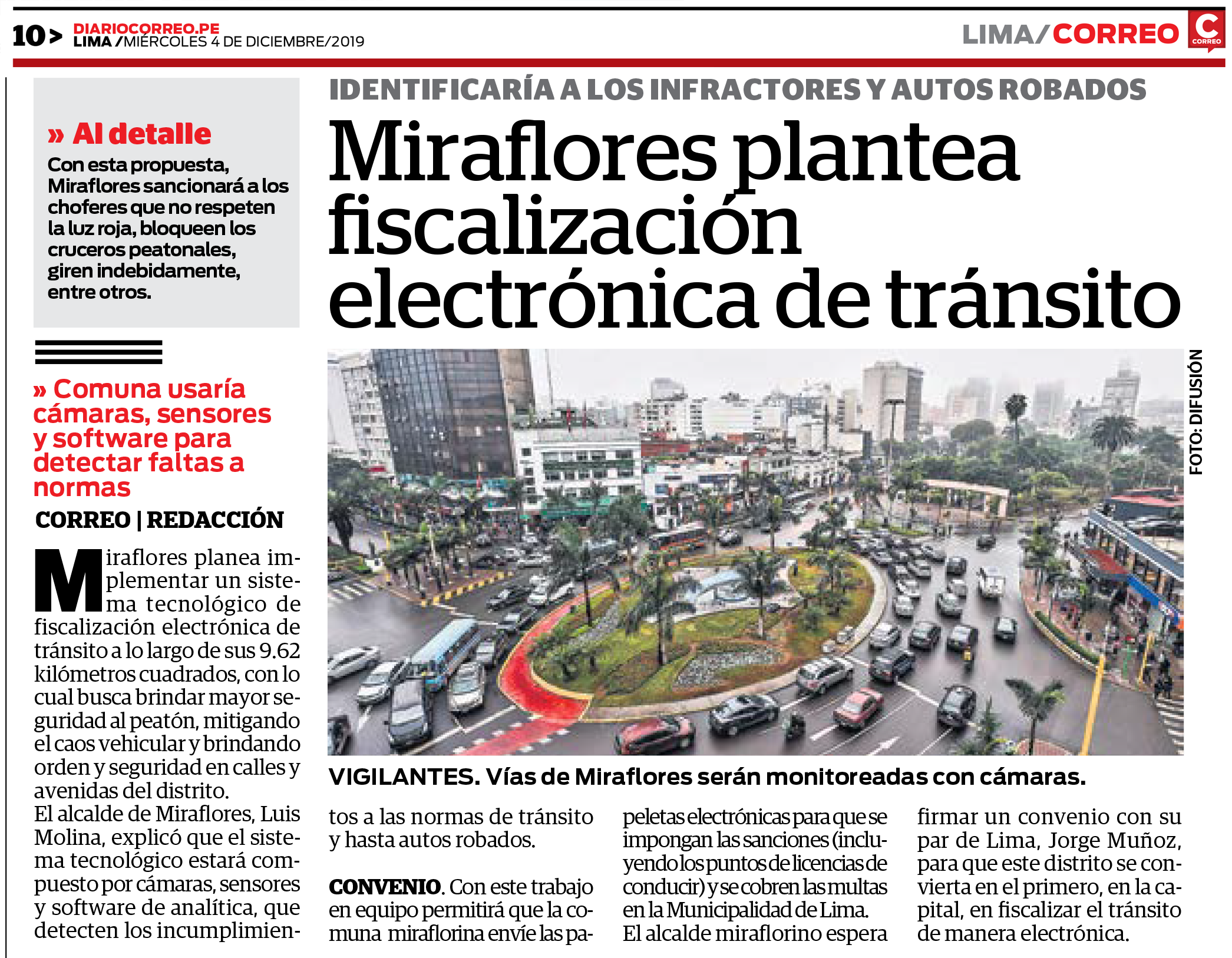 [Diario Correo.- 04 de diciembre de 2019] Miraflores planea implementar un sistema tecnológico de fiscalización electrónica de tránsito a lo largo de sus 9.62 kilómetros cuadrados, con lo cual busca brindar mayor seguridad al peatón, mitigando el caos vehicular y brindado orden y seguridad en calles y avenidas del distrito.