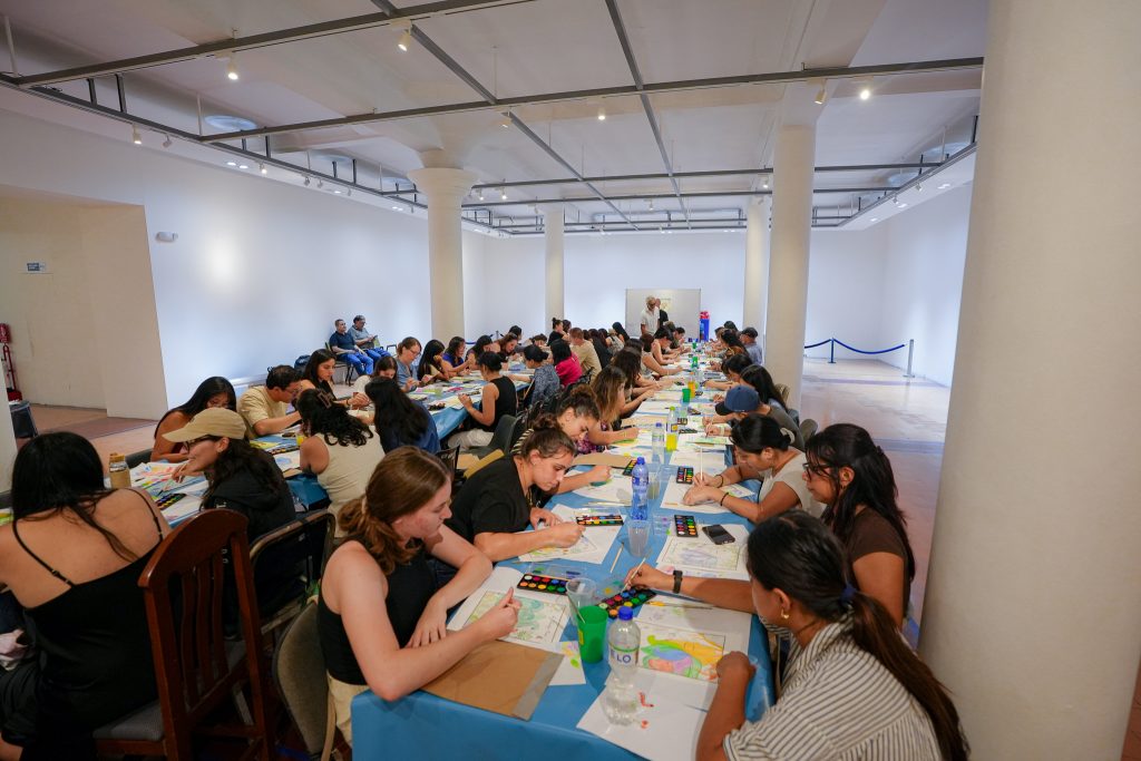 El taller “Experiencia de color mediante la acuarela” estuvo a cargo de Rodolfo Espinosa, reconocido por su trayectoria en la escena artística nacional e internacional. Durante la sesión explicó técnicas de aplicación del color y recorrió cada mesa brindando orientación directa a los asistentes, quienes pintaron una de sus ilustraciones y se llevaron a casa su propia obra.