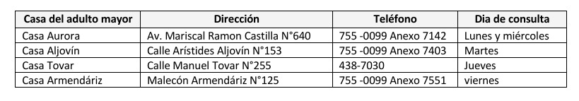 Las consultas medicas se dan en las cuatro casas del adulto mayor del distrito, previa cita desde las 8:00 a.m. a 5:00 p. m., de acuerdo al siguiente cronograma: