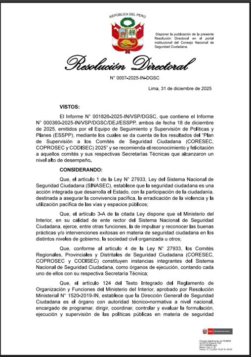 Esta distinción se da en el marco del Plan de supervisión de los comités de seguridad ciudadana Coresec, Coprosec y Codisec, 2025.