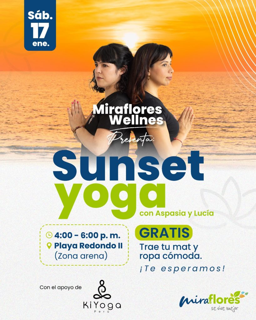 Miraflores, 15 de enero de 2026. Como parte de su compromiso con la promoción de estilos de vida saludables y el uso activo de los espacios públicos, la municipalidad de Miraflores dará inicio a sus actividades deportivas del verano 2026 con Sunset Yoga, una jornada gratuita que se realizará el sábado 17 de enero, de 4:00 a 6:00 p. m., en Playa Redondo II (zona arena).