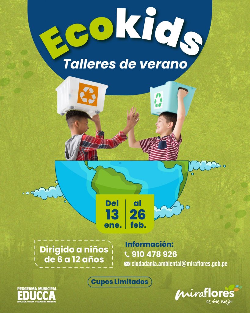 Miraflores, 5 de enero de 2026. – La municipalidad de Miraflores presenta ECO KIDS, una propuesta de vacaciones útiles enfocada en la sostenibilidad ambiental que busca fortalecer la conciencia ecológica y el amor por el cuidado de los espacios verdes en los más pequeños del distrito. Esta iniciativa estará vigente durante el verano a cargo de la subgerencia de Sostenibilidad Ambiental y su programa EDUCCA.