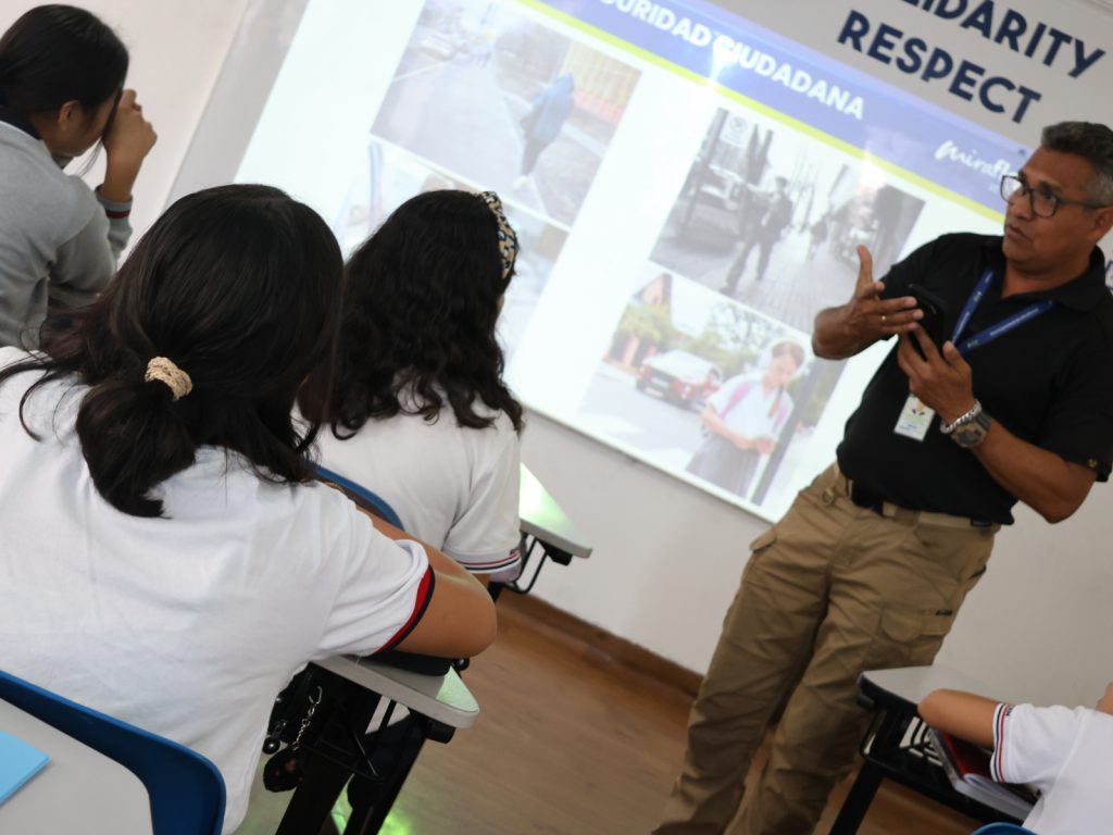 Miraflores, 8 de abril. La Municipalidad de Miraflores, realizó una charla y capacitación en temas de seguridad ciudadana, educación vial y prevención de hechos delictivos dirigida a estudiantes del Colegio Americano Miraflores.