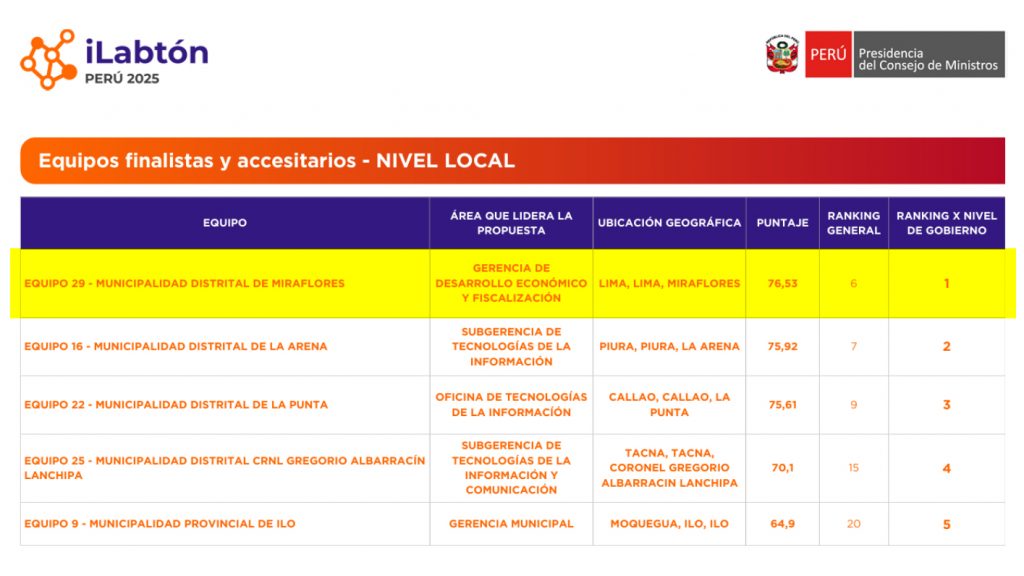 Con este resultado en iLabtón 2025, maratón nacional de innovación para catalizar la creación de laboratorios de innovación que generen valor público sostenible en todo el país, Miraflores reafirma su liderazgo en iniciativas que promueven la innovación pública, la modernización y el fortalecimiento institucional.