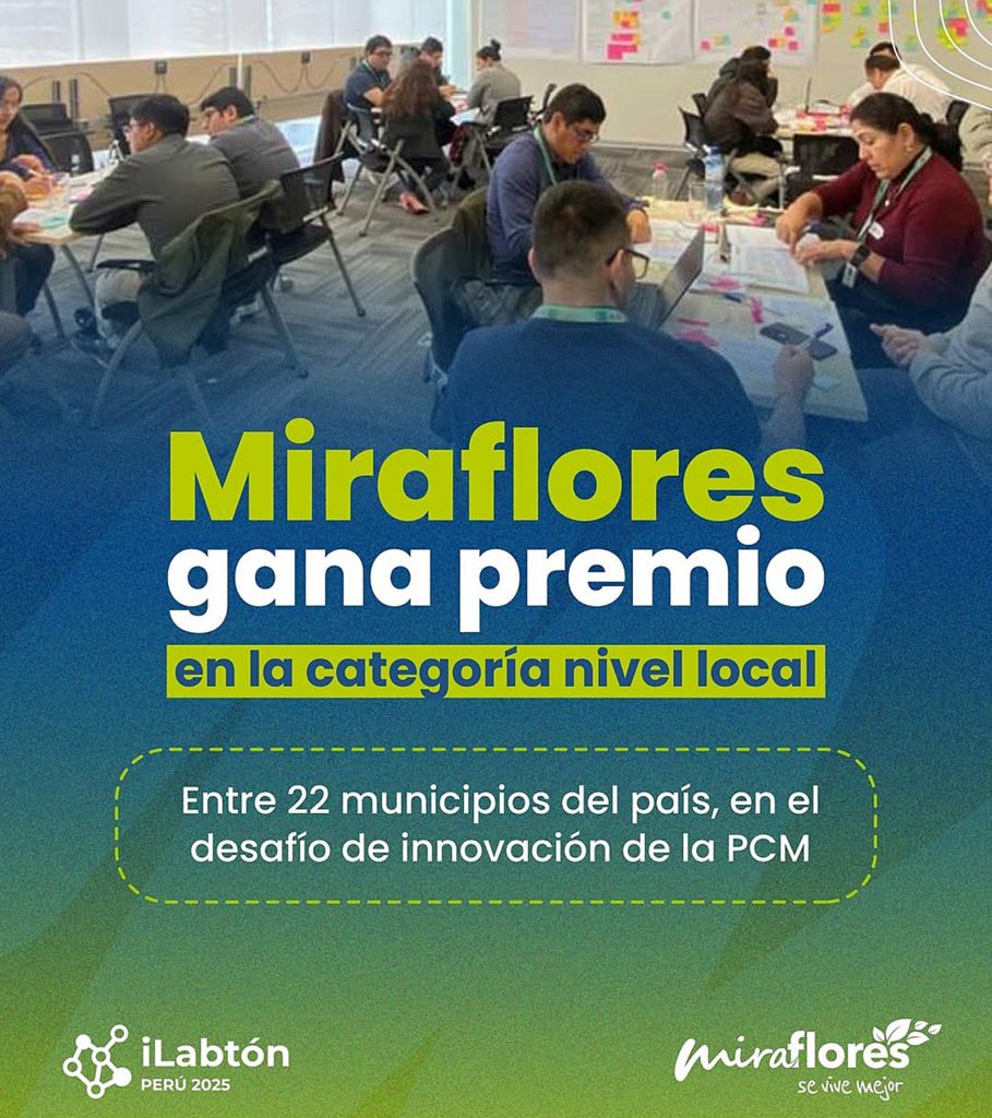 Miraflores, 29 de octubre de 2025. Miraflores, 29 de octubre de 2025. La comuna miraflorina fue reconocida con el primer lugar en la categoría nivel local del iLabtón 2025, iniciativa organizada por la Presidencia del Consejo de Ministros (PCM) que promueve la innovación pública y el uso de tecnologías para mejorar los servicios públicos en el país en los tres niveles de gobierno.