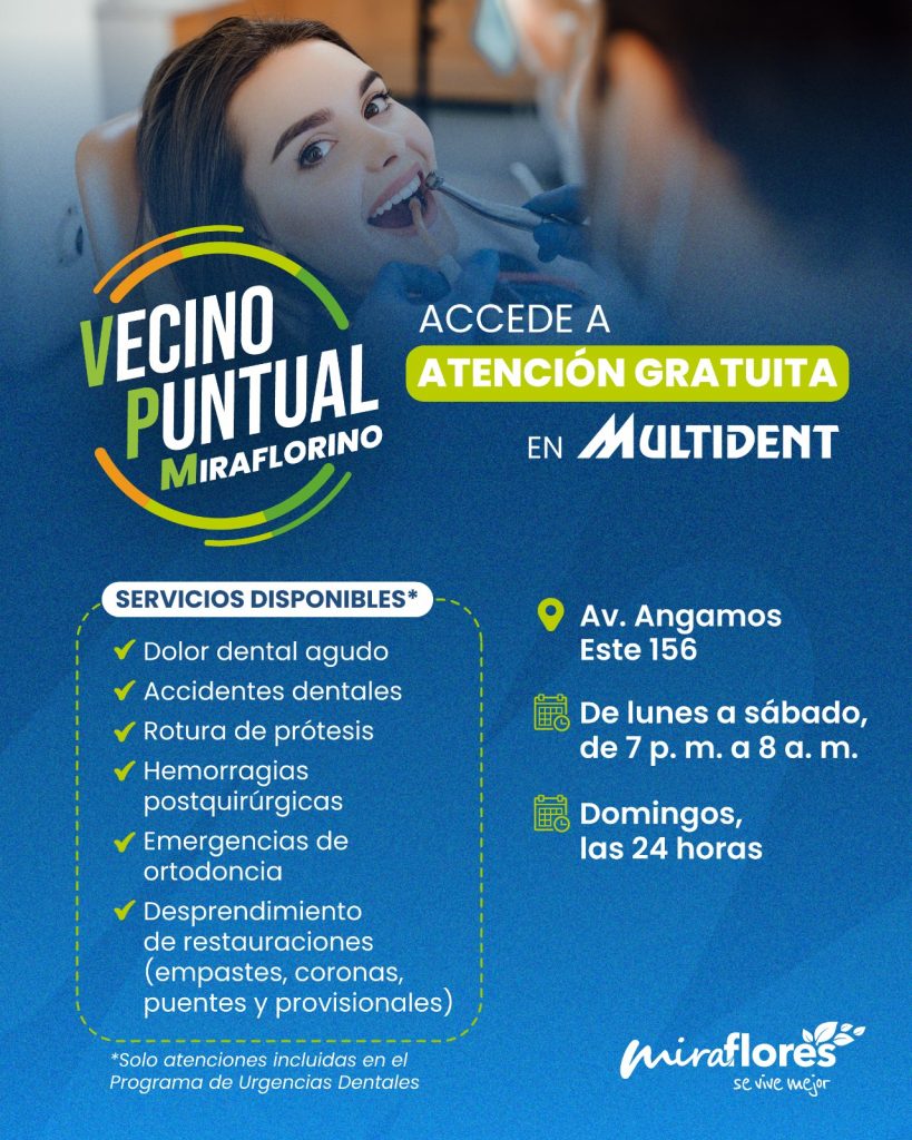 Gracias a este importante convenio firmado entre ambas instituciones, las atenciones por urgencias dentales serán realizadas en la sede miraflorina de Multident, ubicada en la av. Angamos Este 156, y en los siguientes horarios: de lunes a sábado de 7:00 p. m. a 8:00 a. m. y los domingos las 24 horas.