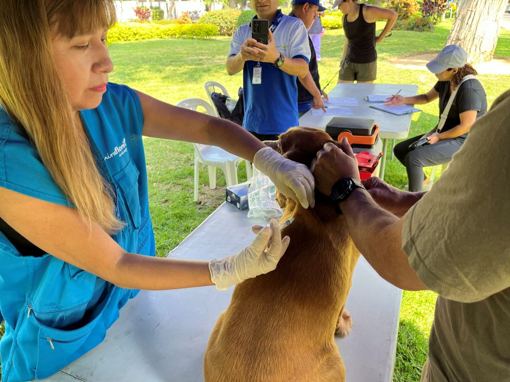 Miraflores, 27 de abril de 2026. Cientos de vecinos se reunieron este domingo en el parque Clorinda Matto de Turner para acceder de manera gratuita a servicios como desparasitación interna, aplicación de antipulgas, limpieza de oídos, vacunación antirrábica y registro de mascotas. Asimismo, se ofrecieron servicios veterinarios a precios accesibles, incluyendo vacunas y una variada oferta de productos en stands especializados.