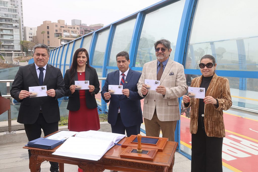 Miraflores, 7 de octubre de 2025.– Al igual que los puentes más icónicos del mundo, el Puente de la Paz, que conecta Miraflores con Barranco, ya cuenta con su propio matasello. El alcalde Carlos Canales Anchorena y el vicepresidente del Serpost, Jorge Luiz Taboada, fueron los primeros en matasellar las estampillas y el sobre preparados para la presentación.