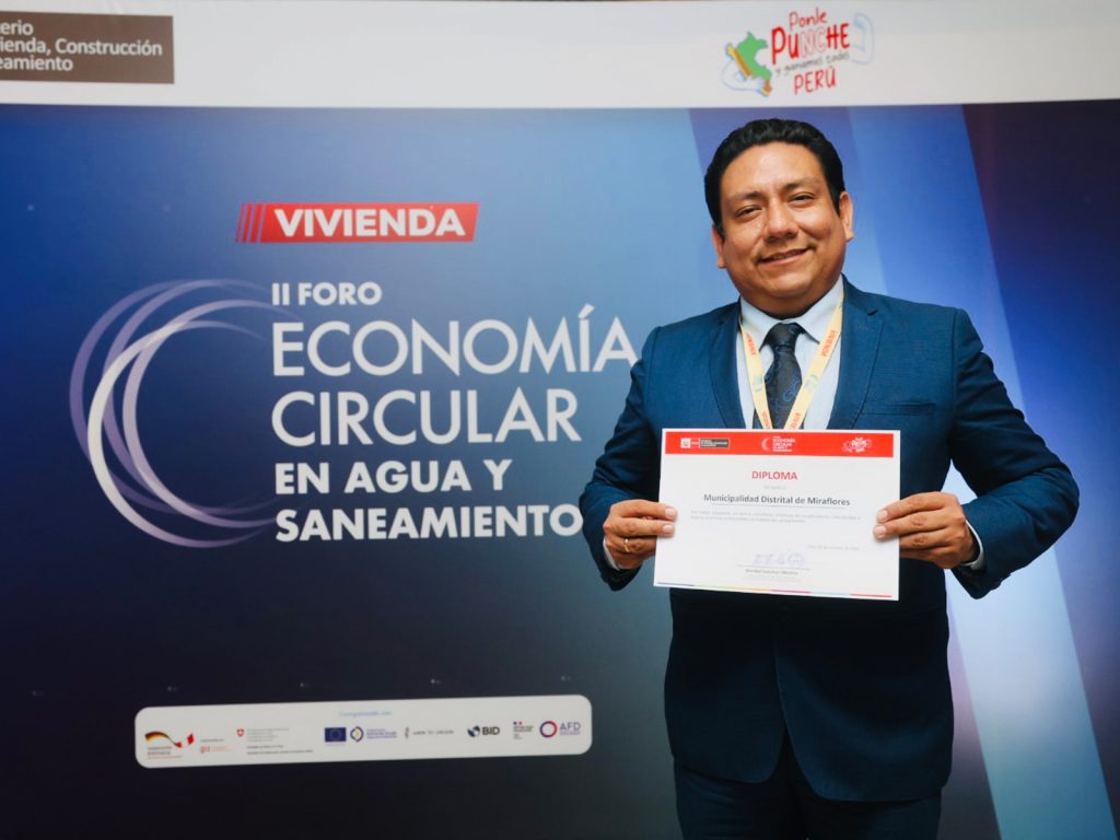 La distinción fue entregada durante el II Foro de Economía Circular en Agua y Saneamiento, organizado por el Ministerio de Vivienda, Construcción y Saneamiento (MVCS). En representación del municipio de Miraflores, el gerente de Desarrollo Económico y Fiscalización, Eduardo Azabache, recibió el reconocimiento.